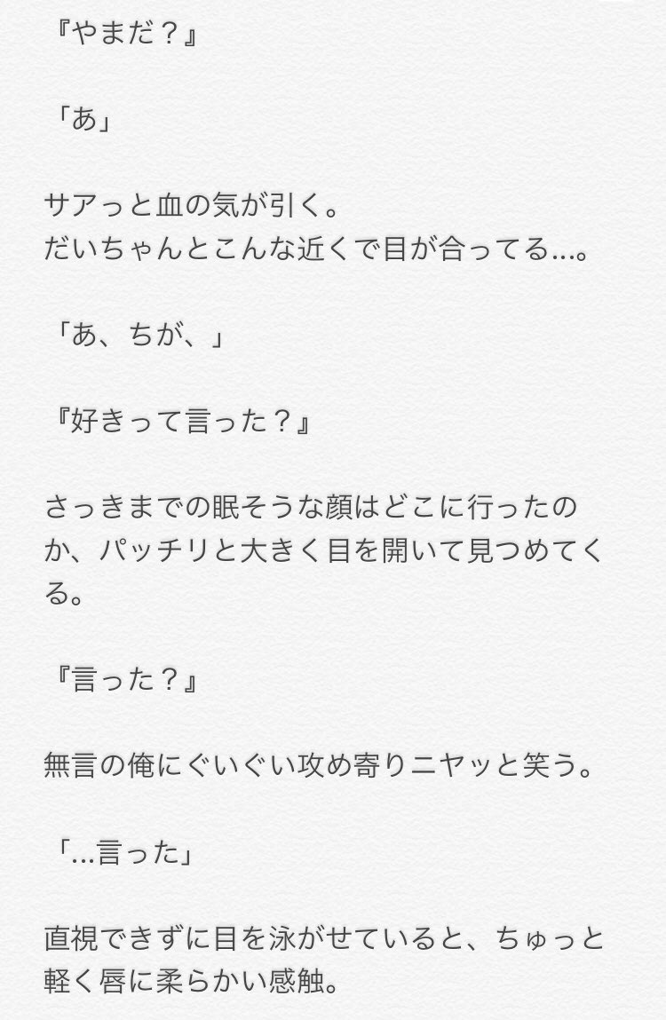 好きだから ありやま(ちね) __君は、あの子のことが好きだから 「協力してほしいんだよね。」 __俺は、君のことが好きだから 「いいよ、協力する。」 「知念がさ、今日俺の家に来るんだよね!」 「よかったじゃん」 「うん!」 俺は今、楽屋で山田とゆとやま けとちね ありちね いのやま ありやま やまあり いのけと ゆとちね やぶたか たかやぶ ひかやぶ やぶいの ひかいの いのひか ひかやま やまゆと いのちね ゆとあり ちねあり けといの けとゆと やまいの ゆやゆと ゆとゆや ありけと やまゆと いの好きだから ありやま(ちね) __君は、あの子のことが好きだから 「協力してほしいんだよね。」 __俺は、君のことが好きだから 「いいよ、協力する。」 「知念がさ、今日俺の家に来るんだよね!」 「よかったじゃん」 「うん!」 俺は今、楽屋で山田と話してる。